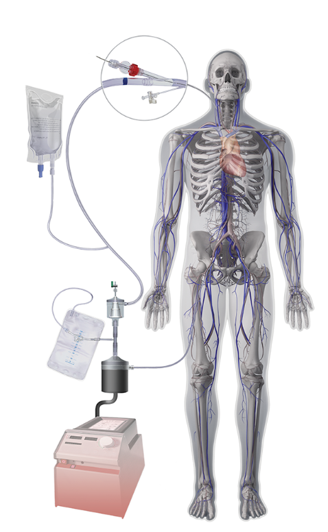 Das AngioVac System ist die Option zur Absaugung im Kreislauf. AngioVac bietet eine innovative Technologie, die während der Absaugung gleichzeitig Blut in den Körper des Patienten zurückfließen lässt, um den Blutverlust zu minimieren.
